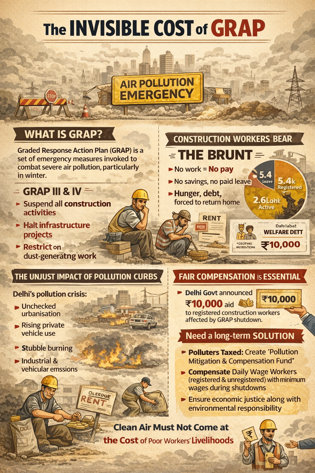 On 18th December 2025, the Delhi Government announced financial assistance of INR 10,000 through Direct Benefit Transfer (DBT) to registered construction workers affected by the curbs under GRAP. While this is a welcome announcement by the Government, a clear policy solution is required in the long run for the provision of minimum wages to construction workers and daily wage labourers, both registered and unregistered, for the duration of GRAP shutdowns. This compensation should not be framed as charity or welfare, but as a rightful payment for income loss imposed by public policy in the interest of collective well-being. If the state mandates a halt to work for environmental reasons, it must also accept responsibility for the economic consequences of that mandate.